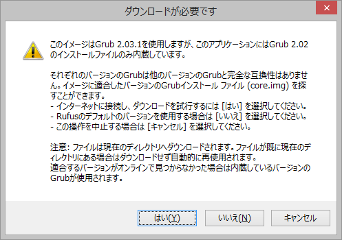 Grubに関する警告が出るので、「はい」を選択してください。